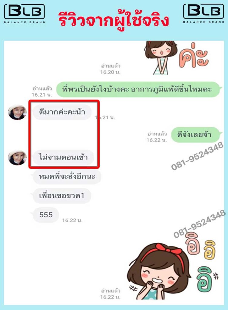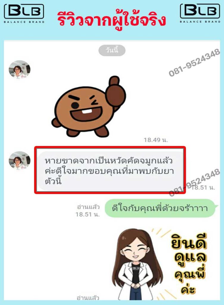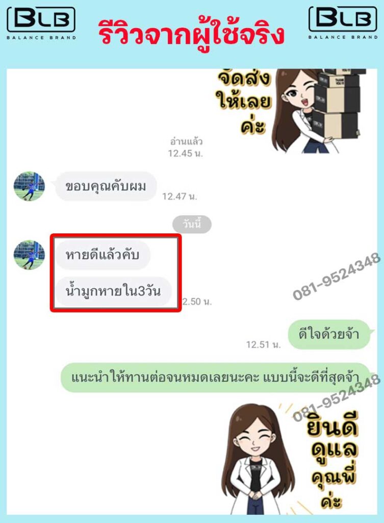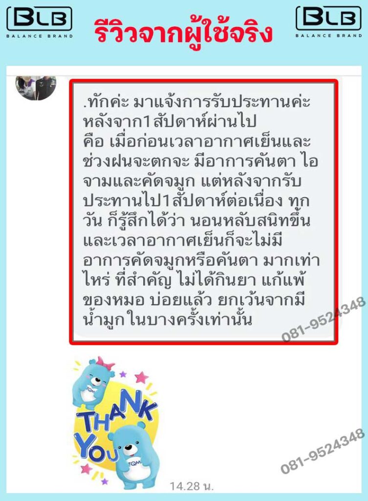 เพื่อนๆ พี่ๆ ท่านใด ที่กำลังมีอาการจมูกอักเสบหรือโพรงจมูกอักเสบอยู่ แอนแนะนำ BLB U เลยนะคะ ไม่ต้องลองผิดลองถูกให้เสียเงินเสียเวลา บอกเลยว่าไม่ผิดหวังแน่นอน ป้าแม่บ้านและแอน ขอเป็นอีกหนึ่งตัวอย่างให้ (เลื่อนลงด้านล่าง ดูรีวิวเพิ่มเติมได้) ขอเป็นกำลังใจให้ทุกคนนะคะ เป็นได้ก็หายได้จ้า