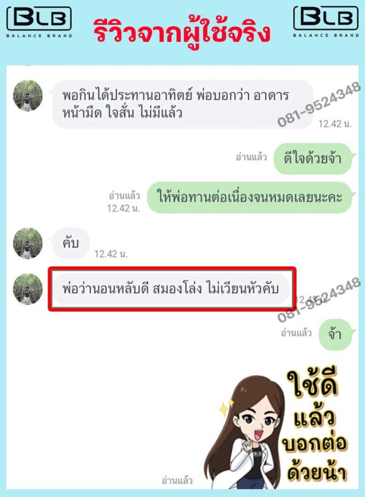 ผลลัพธ์หลังจากทานได้ 2-3 วัน อาการกลับดีขึ้นเฉยเลย รู้สึกโล่งในหัว ไม่เวียนหัว นอนหลับสนิท ตื่นมาแล้วสดชื่น พอทานต่อเนื่องได้ประมาณ 1 สัปดาห์ อาการโดยรวมถือว่าดีขึ้นเร็วมาก เริ่มมีความหวังเลยค่ะ