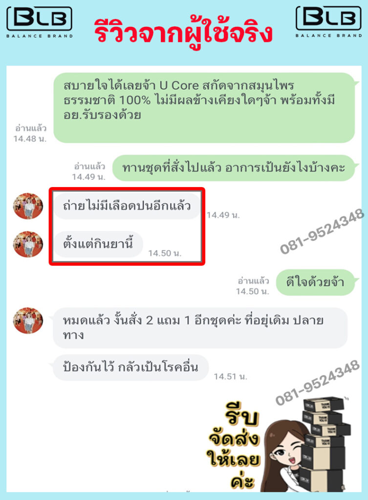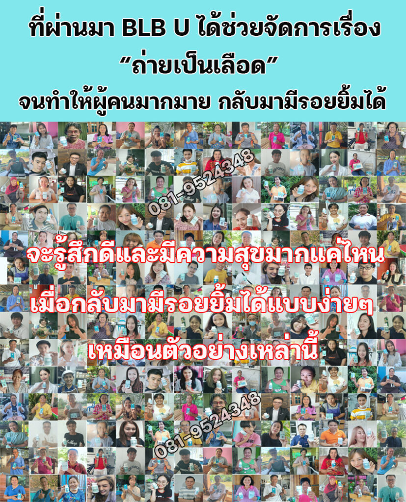 แอนได้เล่าอาการให้ป้าแม่บ้านที่ทำงานฟัง แล้วแกก็พูดขึ้นมาว่า ก่อนหน้านี้ป้าก็เคยถ่ายเป็นเลือด รักษายังไงก็ยังเป็นๆหายๆ จนกระทั่งมาได้ผลิตภัณฑ์อาหารเสริมสมุนไพรชื่อว่า BLB U ช่วยเอาไว้ จากการแนะนำของญาติ แกเลยแนะนำให้ลองทานดู