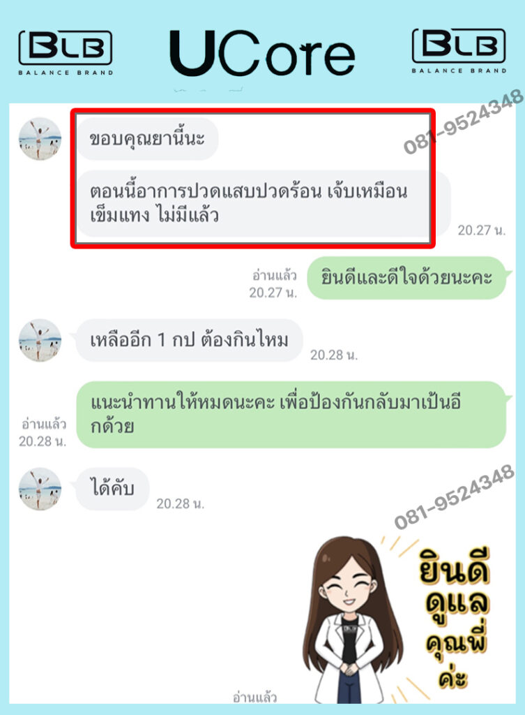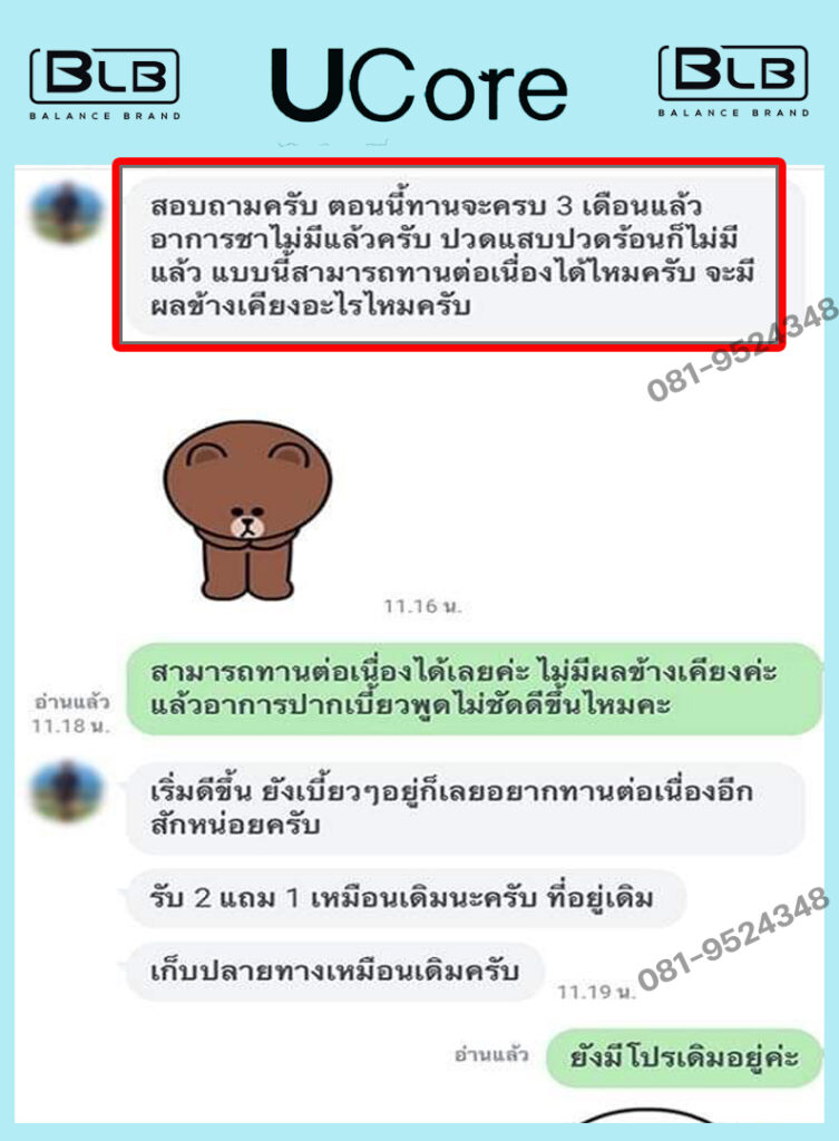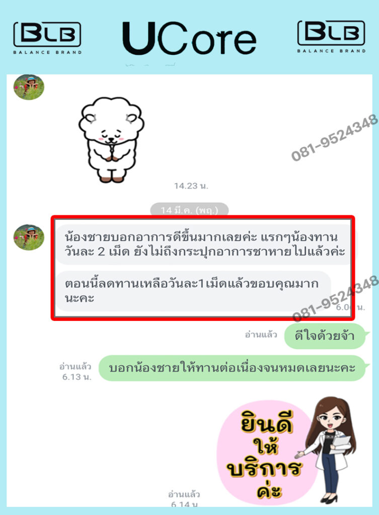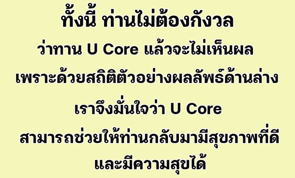 ผมจึงตั้งใจทานต่อเนื่องจนหมด ยอมรับว่าตะลึงกับผลลัพธ์เลยครับ ปัจจุบันผมทานชุดที่สั่งมาหมดได้ประมาณครึ่งปีแล้ว สังเกตุได้ว่า ตั้งแต่เริ่มทาน U Core มา อาการก็ดีขึ้นเรื่อยๆ ตามลำดับ รู้สึกร่างกายสดชื่นดีมาก