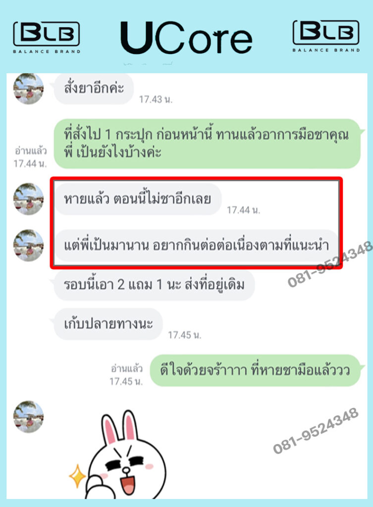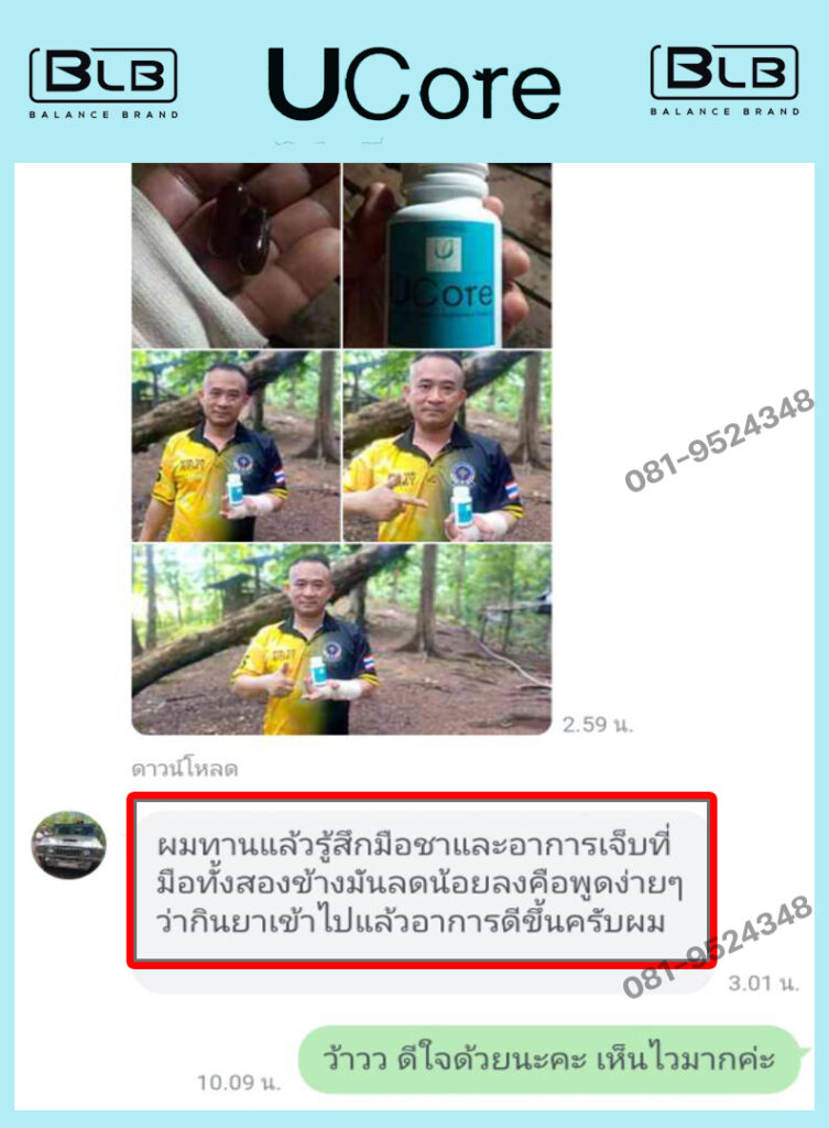วันนึงป้าแม่บ้านที่ทำงาน รู้ว่าผมชามือชาเท้าบ่อย จึงได้เล่าให้ฟังว่า ก่อนหน้านี้ ป้าก็เคยเป็น กินยาทายายังไง ก็ไม่หาย จนกระทั่งมาได้ผลิตภัณฑ์อาหารเสริมสมุนไพรชื่อว่า U Core ช่วยเอาไว้ ป้าจึงแนะนำให้ผมลองทานดู